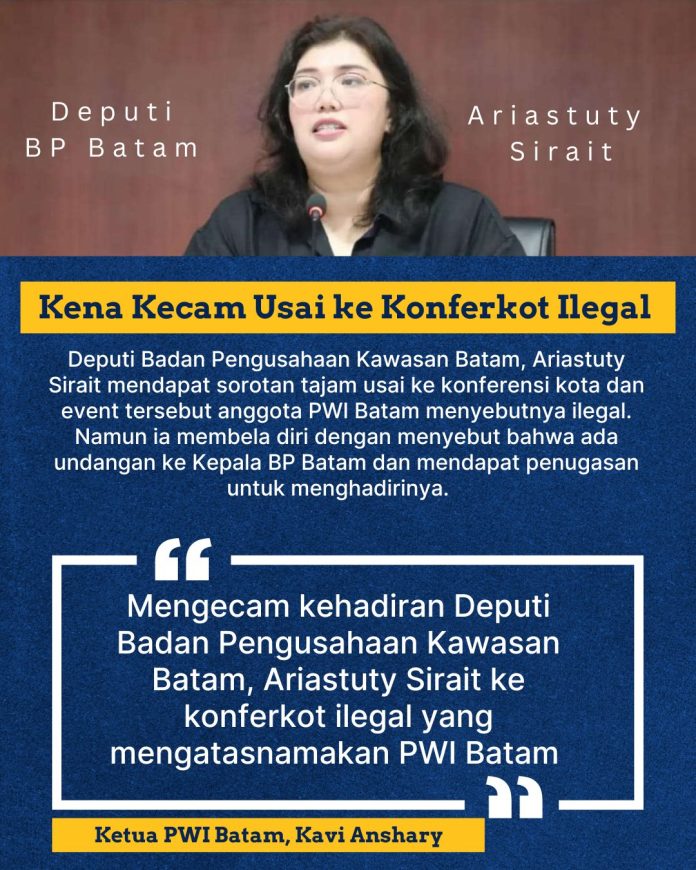 Batam, Haqqnews.co.id – Ketua PWI Kota Batam, M. Kavi Anshary mengecam kehadiran Deputi BP Batam Ariastuty Sirait ke konferkot ilegal yang mengatasnamakan PWI Batam. Ariastuty hadir ke konferkot bertempat di Kings Hotel, Minggu (27/4/2025), tersebut.