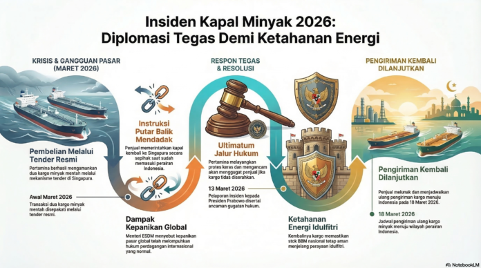 Haqqnews.co.id – Pemerintah Indonesia berhasil memaksa pemasok asal Singapura melanjutkan pengiriman dua kargo minyak mentah. Kedua kapal yang sempat patah balik secara sepihak tersebut, kini kembali berlayar menuju perairan Nusantara dan dijadwalkan bersandar pada Rabu (18/3/2026).