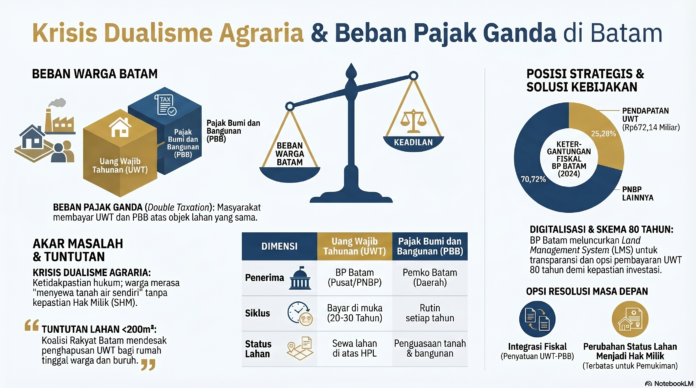 Haqqnews.co.id –Mencuat persoalan beban pajak ganda di Pulau Batam, Provinsi Kepulauan Riau. Warga pulau industri itu, kini mendesak penghapusan Uang Wajib Tahunan Otorita (UWTO) atau UWT untuk kawasan perumahan. Sebab pemungutan UWT telah menimbulkan beban pajak ganda bagi masyarakat.