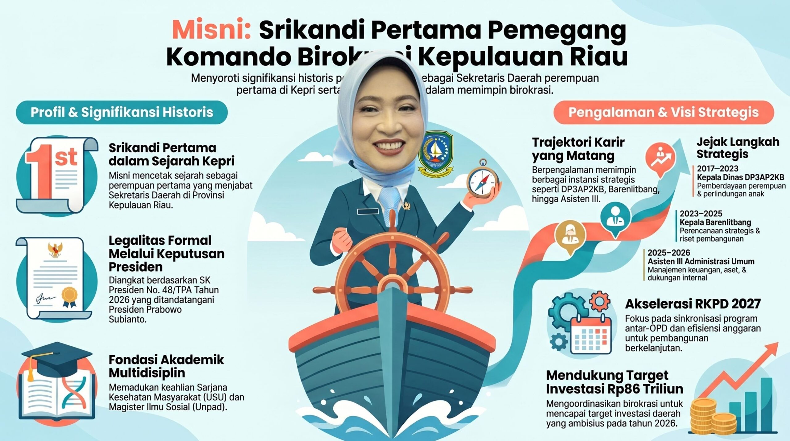 Haqqnews.co.id – Misni, S.K.M., M.Si. resmi mengukir sejarah baru di Kepulauan Riau (Kepri). Ia menjadi perempuan pertama yang menjabat sebagai Sekretaris Daerah (Sekda) definitif sejak provinsi ini berdiri Gubernur Kepri Ansar Ahmad melantik Misni di Gedung Daerah, Kota Tanjungpinang, Senin (27/4/2026).